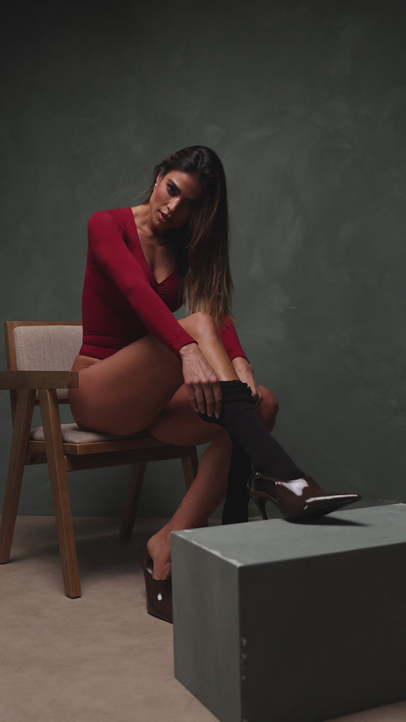 Woman wearing a maroon bodysuit against a white background