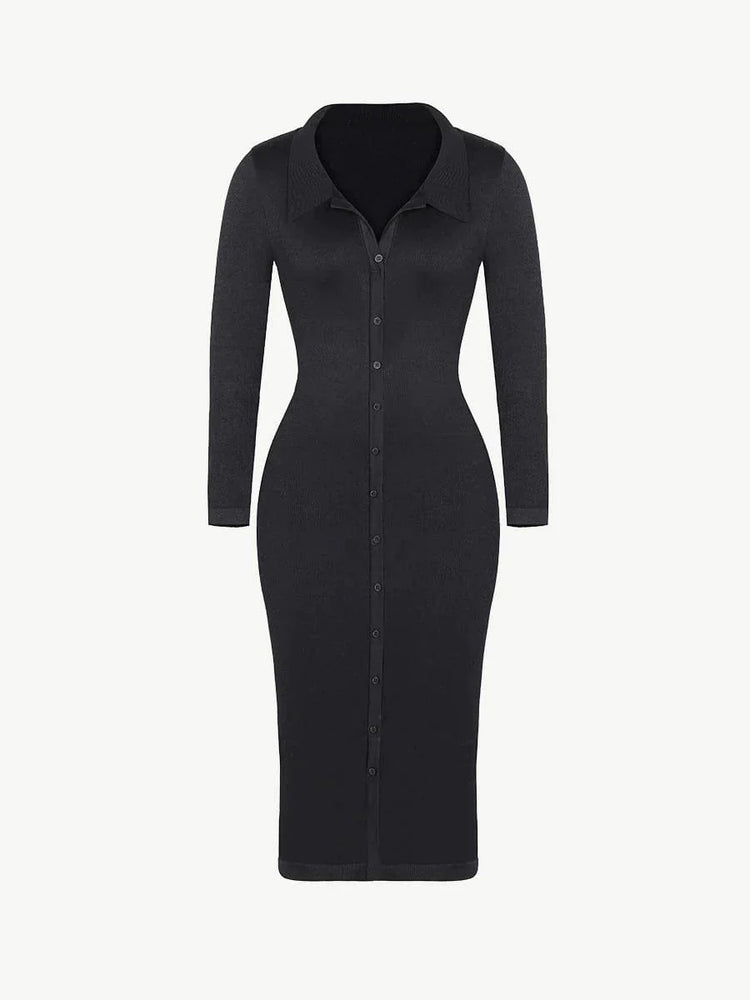 Introducing our Shapewear Dress Front Button Collar with a built-in shapewear panel, designed to shape your curves with a 360 degree ribbed compression material in the tummy for a snatched waist. It features a button down (buttons not functional) & collar look and can be worn braless. This Knee length dress is perfect for any occasion. Experience the comfort and confidence that comes with our Shapewear Dress. Order now and discover a new level of style and functionality in your wardrobe!